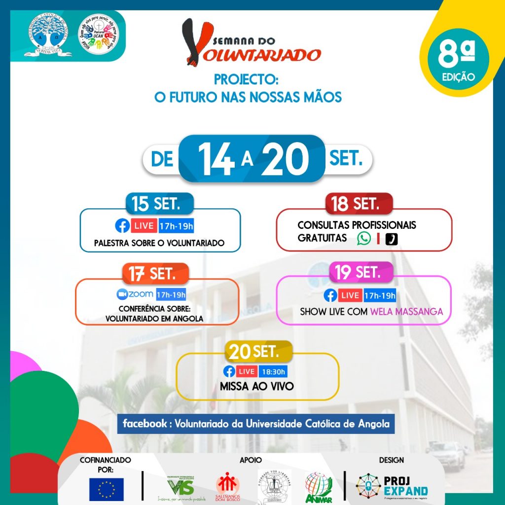Sobe o lema “Quem pode faz, quem pode mais faz voluntariado”, o projecto “O futuro nas nossas mãos” dirigido pelo grupo de voluntariado da Universidade Católica de Angola realiza, de 14 a 20 de setembro a 8ª edição da semana do voluntariado, com uma vasta agenda de actividades.